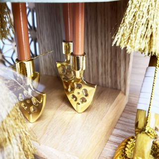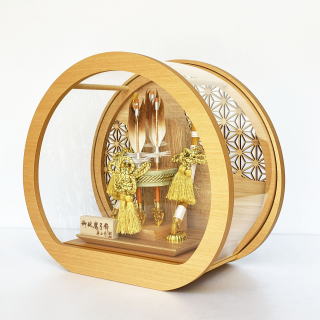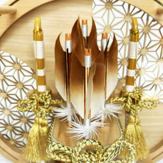綺麗な茶ぼかし染めを施した4本の矢羽根には、「青龍」・「白虎」・「玄武」・「朱雀」の四神を示し、東西南北の魔を除ける方位除けの意味があります。天然木を使用した木製の弓飾りや飾台金色と緑色で組み上げられた綺麗な組紐など、温かみのある配色が綺麗です。お洒落なデザインで小型化が進む現在の住宅環境に適した円型デザインが人気の破魔弓飾りです。
