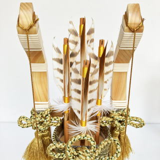美しい色合いが特徴的な天然羽根を使用した4本の矢羽根には、4本の矢羽根には、「青龍」・「白虎」・「玄武」・「朱雀」の四神を示し、東西南北の魔を除ける方位除けの意味があります。
