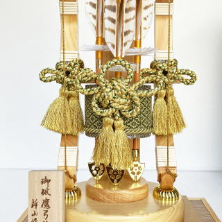 小サイズの破魔弓飾りですが、日本銘木「天竜桧」と豪華な「甲州印伝革」を合わせた日本伝統工芸の美と豪華さをご堪能頂ける逸品でございます。