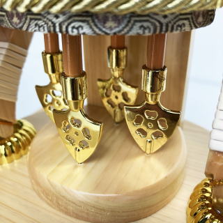 印伝の伝統文様として代々伝えられてきた菱形菊の連続文様で、古来より不老不死の象徴である「菊」と厄除け・魔除けの意味を持つ「菱形」を合わせた吉祥文様「菱菊」を漆で模った「甲州印伝革」を使用した豪華な矢筒。ケースと同様に「天竜桧」を使用して造られた飾り台や籐巻き弓が特徴的です。