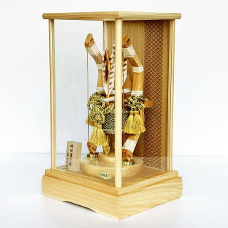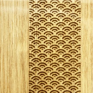 本体もケースも全て国産の「天竜桧(ヒノキ)」を使用した総桧造りで高級な破魔弓飾りでございます。高級感漂う桧ケースのバックは、古くから大変縁起の良い吉祥文様「青海波」柄をレーザー彫りし仕上げました。