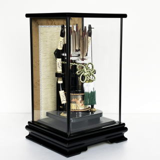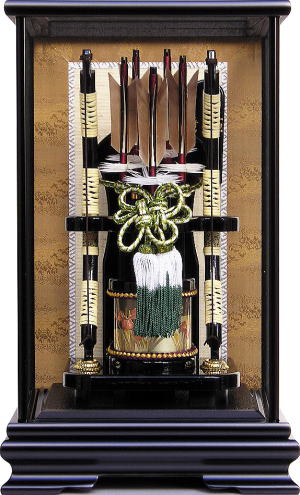 艶を消した落ち着きのある伝統的な黒塗枠ケースです。上品な絵柄のヘリを付けたシンプルな背景が豪華な弓矢飾りを引き立てます。