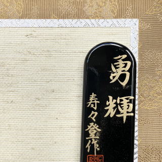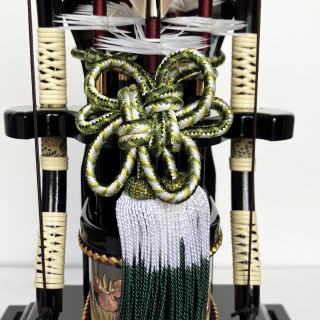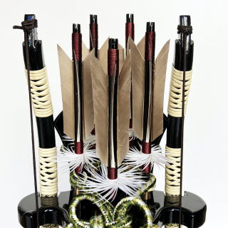 熟練した技法で本金箔を手作業で貼り仕上げた豪華な矢尻に、緑系色の組紐を使用した綺麗な飾り紐や吉祥文様として縁起の良い「菖蒲」を模った彫金細工をあしらった矢筒が特徴的です。本金箔押しされた矢尻の輝きは格別で高級感漂う破魔弓飾りです。