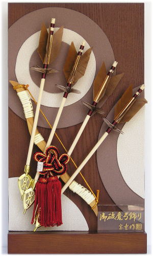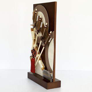薄型で奥行を取らずにお飾りしやすい衝立(ついたて)型で、ガラスケース無しタイプの破魔弓飾りです。